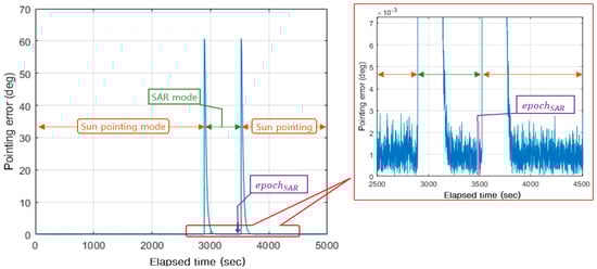 In the case of the attitude control error, the multistatic SAR imaging simulation was performed for the case where the attitude control error for each axis of all SAR microsatellites was 0.005°, 0.01°, and 0.02° (1σ). Consequently, no significant change of more than 1% could be confirmed in the spatial resolution or PSLR. No further simulations were performed because the attitude control error generally does not exceed 0.02° (1σ) for the SAR microsatellites.