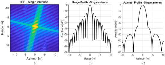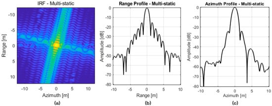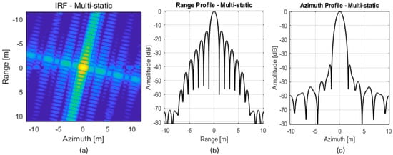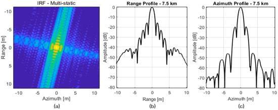 Imaging simulation results of the final designed multistatic SAR system, IRF (a), range profile (b), and azimuth profile (c).