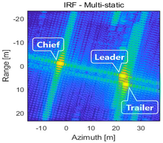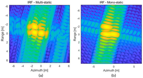 To finally verify the performance of the multistatic SAR system for VHRSI, a multistatic SAR imaging simulation was performed for multiple targets spaced 1.5 m apart. The multistatic SAR imaging simulation for near-multi-targets is performed to confirm the ability to identify multiple targets at close range, which is limited by point-target image analysis. Figure 25 denotes the simulation results of SAR imaging for near-multi-targets of a multistatic SAR system (a) and a monostatic SAR system (b). Through the result of the multistatic SAR system in Figure 25a, it can be confirmed that the target’s image at an interval of 1.5 m is separated and identified. Conversely, in the case of a monostatic SAR system, two targets in the azimuth direction interfered with each other and were crushed like one target. In this case, target identification is impossible. The resolution enhancement function of the multistatic SAR system is verified through the simulation results of SAR imaging for near-multi-targets.