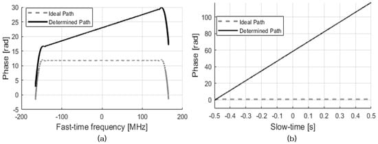 Phases of the received signal that has completed signal compressions in the range and azimuth directions. Fast-time frequency domain for the range direction (a) and slow-time domain for the azimuth direction (b). The solid and dotted lines represent the phase of the received signal under the determined and designed orbits, respectively.