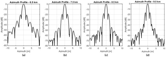According to Equation (2), the theoretical , antenna diameter of the azimuth direction allowing the azimuth resolution to be 1 m, is 2 m. The theoretical , synthetic aperture length when is 2 m, was calculated to be 10.2 km, using Equation (3).