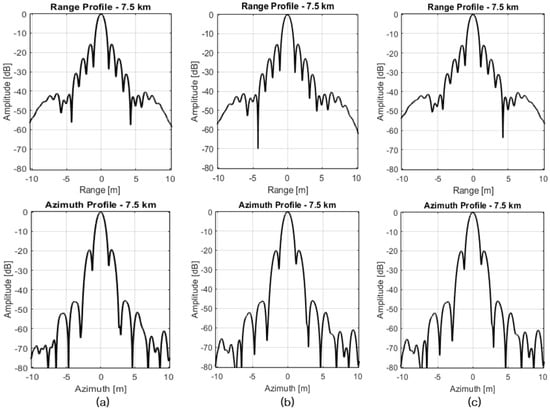 Range profile (top) and azimuth profile (bottom) with respect to the relative orbit determination error, 0.1 m (a), 0.5 m (b), and 1.0 m (c).