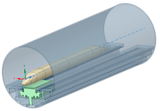 The maglev flight tunnel designed in this paper consisted of accelerating, constant speed, and decelerating sections. The overall length of the tunnel was 1 km, the acceleration section length was 450 m, the constant speed section length was 150 m, and the diameter was 6 m. In this study, we focused on how the aerodynamics changed in the closed tunnel during the acceleration and constant-speed phases. A simplified schematic of the maglev flight tunnel is shown in Figure 1, with a scaled high-speed train used in railway transportation as the model, The model vehicle was 2.2 m high and 60 m long. The blockage effect for the aerodynamic test in the flight tunnel for the high-speed train was similar to the traditional wind tunnel test, which was chosen as 20%, as shown in Figure 2.