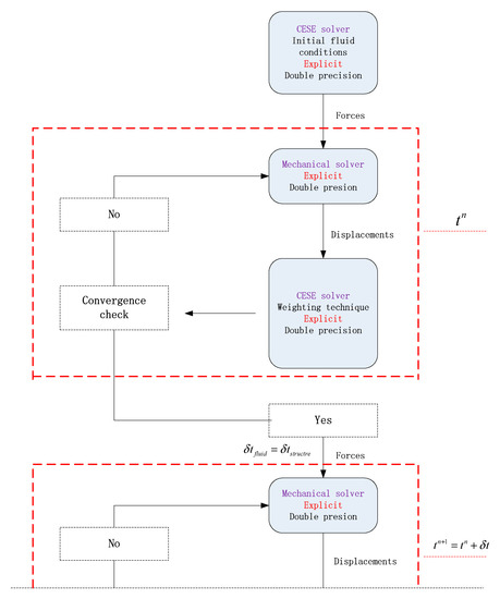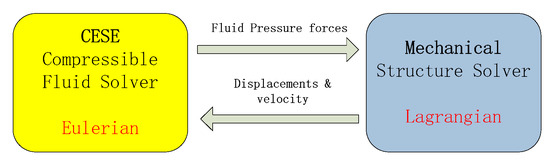 For the aerodynamic–structure coupling problem, the fluid and structure solvers must be solved uniformly, information transfer variables found, and coupling platform established. Here, the CE/SE and structural dynamics algorithms can be coupled to realize the aerodynamic–structure coupling simulation of the high-speed motion process. Since the two algorithms can be calculated independently, the flow field and structure can be meshed, and the time step set separately. The coupling system automatically tracks the minimum time step in the two domains for calculation. The aerodynamic–structure coupling process requires the Lagrange structure to be embedded in the fluid domain and the node displacement and velocity information to be transferred to the fluid solver in each time step. During the initial solution time step, the CE/SE algorithm first uses the initial velocity and pressure to solve the compressible flow field and obtain the interface pressure. Then, the pressure is applied to the structure domain as the boundary condition. After solving the structure domain, the displacement and velocity of the node are obtained, and the displacement and velocity of the boundary node are returned to the fluid field so that the fluid and structure enter the convergence iteration process. When the convergence conditions are satisfied, the next time step is calculated. The specific fluid–structure coupling iterative process of the whole system is shown in Figure 3 and Figure 4.