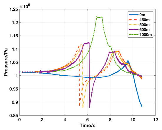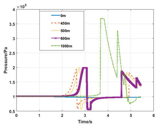 The results of each cross section in working condition 2 are shown in Figure 6. The pressure curve variation rule shows that the 450, 500, and 600 m cross sections exhibited similar pressure waves to those of working condition 1. However, the 1000 m cross section at the end of the pipeline experienced multiple peak values, which could be the result of multiple pressure waves on the end wall.
