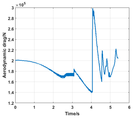 Figure 7 and Figure 8 show working conditions 1 and 2, respectively, as the aerodynamic changes over time. The case with a maximum model speed of Mach 0.5 showed that the aerodynamic drag was at a constant speed in the acceleration section with no obvious changes, and the deceleration period had a maximum resistance of 1.1 times the lowest resistance. At the maximum speed of Mach 1.0, the aerodynamic resistance of the moving model began to decrease slightly and reached the minimum in the deceleration stage, with the peak value of aerodynamic resistance about twice that of the earlier stages. Both the variations in the drag curves for the two conditions show periodic fluctuations at Mach 0.5; this phenomenon occurs during the acceleration period, while for Mach 1.0, the periodic fluctuation shows during the deceleration period. This difference is mostly correlated with the wave propagation speed.