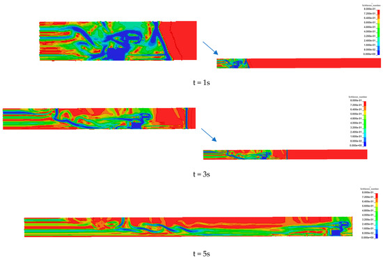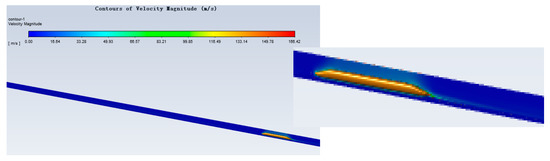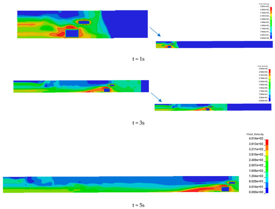 Figure 9 and Figure 10 are three-dimensional velocity cloud diagrams and the Schlieren number results of the unsteady flow field evolution in the acceleration, uniform-speed, and deceleration processes of the model in a straight, closed pipe. The propagation process of the wave system in the high-speed motion process of the model in the pipe can be clearly seen in the figure. The forward moving speed of the wave front was significantly faster than that of the model. Therefore, when the model does not reach the end of the pipe, the wave front reaches the wall ahead of the model and produces a reflection.