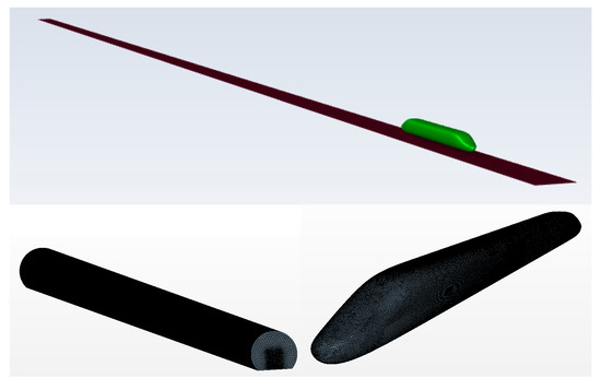 The structural finite element model was mainly composed of the maglev flying wind tunnel platform and test model. The fluid model schematic diagram is shown in Figure 4. The length of the fluid grid field was 1000 m. According to the characteristics of the CE/SE coupling solution algorithm, a structured grid was adopted for the flow field with a minimum grid size of 0.01 m. We assumed that the platform and structural models had no deformation and were made of rigid materials.