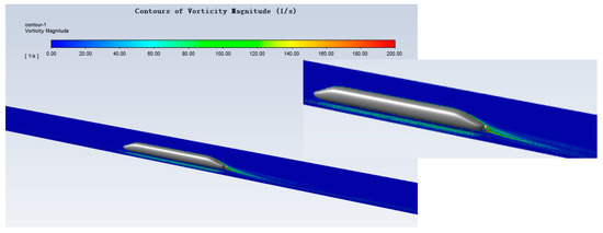 The aerodynamic properties of the model such as the speed, pressure, and vortex were calculated and displayed in distribution clouds, as shown in Figure 12, Figure 13 and Figure 14. For models with a blockage of 20%, the blocking effect during the model movement was evident. From the numerical simulation results, the test vehicle model had a relatively weak tail flow and tail vortex when it moved in the maglev flight tunnel. In working condition 1 with a speed of 170 m/s, the tail flow was approximately 15 m long during the acceleration phase, as shown in Figure 13. On the surface and vicinity of the test vehicle model, the static pressure distribution pattern was similar to that of the vehicle model in a conventional wind tunnel, with higher pressure distributed at the front and end of the model, and lower pressure distributed at the middle of the model, as shown in Figure 14.