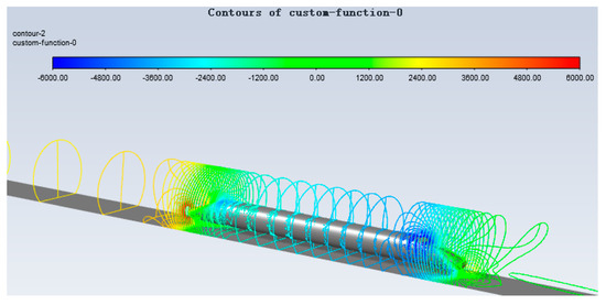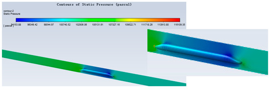 On the tunnel wall in front of the dynamic test vehicle model, a higher static pressure area was created. However, the pressure difference in these two areas was relatively large: approximately 5000 Pa between the high- and low-pressure areas, as shown in Figure 15.