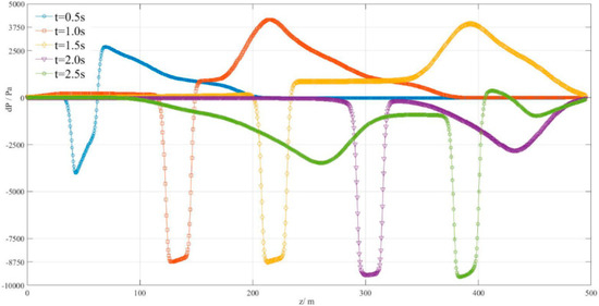 When the wind tunnel was in use, the compression wave, expansion, and airflow disturbance caused by the high-speed movement of the model were reflected in the tunnel body, presenting different pressure states at different positions. To study the dynamic aerodynamic characteristics of the gas in the pipe caused by the movement of the model car, the flow field in the pipe at different times was recorded and analyzed, and the axial static pressure distribution at the top of the pipe wall at different times is shown in Figure 16.