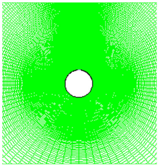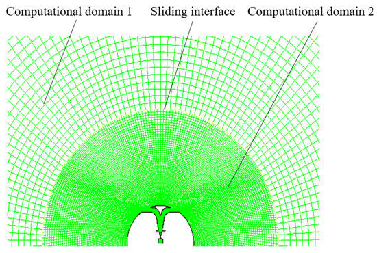 According to the working characteristics of supersonic fluidic elements and the specific conditions, the geometric model is simplified to 2D. Figure 3 shows the geometry model and boundary conditions of the external flow field of a single jet ejecting from the nozzle exit, where the rotation axis passes the origin o in a vertical direction, and the projectile rotates in a counterclockwise direction. To ensure the full development of the jet ejected from the nozzle exit, the far field radius (R) is taken as ten times the projectile radius (r). The area near the nozzle is marked as Zone I, and the other part is marked as Zone II. Structured grids are generated in the computational domain, as shown in Figure 4. The grid near the nozzle and on the wall is densified according to the actual flow. In the calculation process, the grid is optimized in real time according to the current flow situation every 1000 iteration steps, making it more in line with the needs of the flow field.