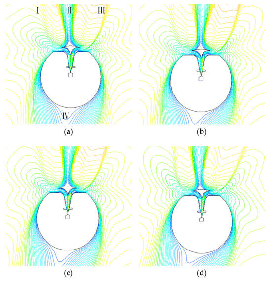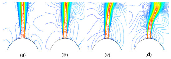 (5) As the radius of the projectile body was 0.14 m for the calculation model, it can be seen from Figure 8 that the impact of rotation on jet flow is not obvious near the surface of the projectile body, but the impact of rotation cannot be ignored at a distance (greater than 0.3 m) from the surface of the projectile body; moreover, with the increase in rotating speed, the impact of rotation is closer to the surface of the projectile body. This is mainly because the Coriolis force increases with the increase in rotating angular velocity, which makes the high momentum fluid near the wall also prone to track deflection.
