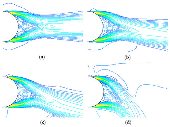 Mach number contours of two parallel external jets at different rotational angular velocities: (a) 0 r/s, (b) 5 r/s, (c) 10 r/s, (d) 20 r/s.