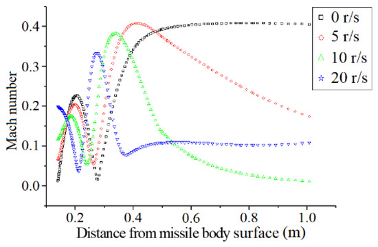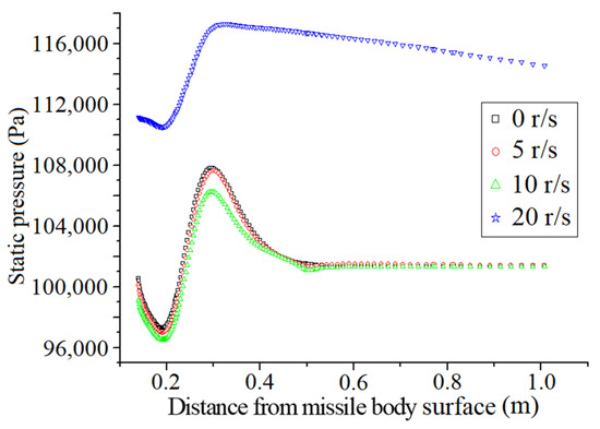 (4) As the calculation model had the projectile radius as 0.14 m, it can be seen from Figure 11 that with the increase in rotational angular velocity, the position where the maximum Mach number appears at the x-axis is closer to the projectile surface, but the maximum Mach number decreases. It can be seen from Figure 12 that when the speed is less than 10 r/s, the static pressure at the x-axis is almost not affected by rotation, but when the speed is 20 r/s, the effect of rotation cannot be ignored, so a conclusion similar to that in Section 3.1 can be obtained.