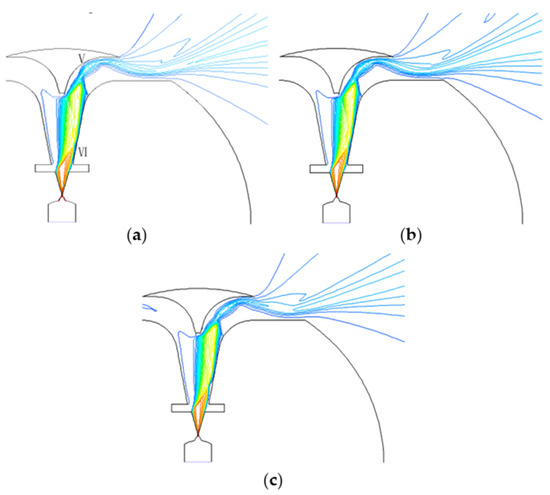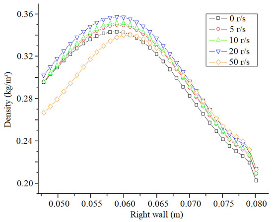 It can be seen from Figure 16 that the density distribution on the right wall at the angular velocity of 50 r/s is obviously different from that at the angular velocity less than 20 r/s. This is because at the angular velocity of 50 r/s, the centrifugal effect of internal flow is more obvious. When the location of the attachment point is pushed back, the area of the vortex zone at VI is significantly increased, and the pressure is reduced, causing the decrease in density. When the angular velocity is less than 20 r/s, the centrifugal effect in the internal flow field is not obvious. The disturbance from the external rotating flow field is introduced into the internal flow field from the left nozzle. With the increase in the angular velocity, the intensity of disturbance increases, so the density of the right wall will increase correspondingly, but the increase in amplitude is so small that it can be ignored.