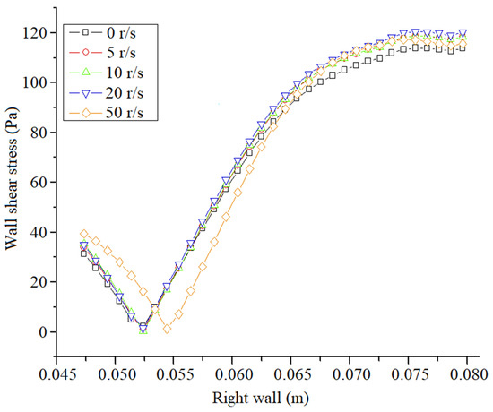 Distribution of shear stress on the right wall of supersonic fluidic element at different rotational angular velocities.