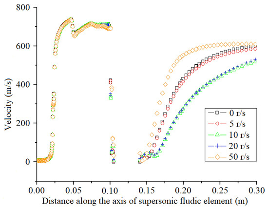 Velocity distribution along the symmetrical axis of supersonic fluidic elements at different rotational angular velocities.