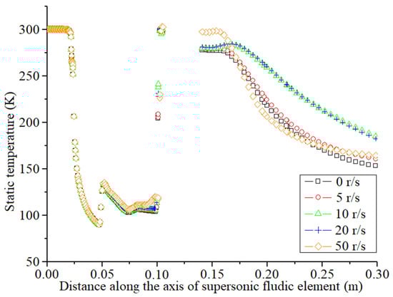 Temperature distribution along the symmetrical axis of supersonic fluidic elements at different rotational angular velocities.