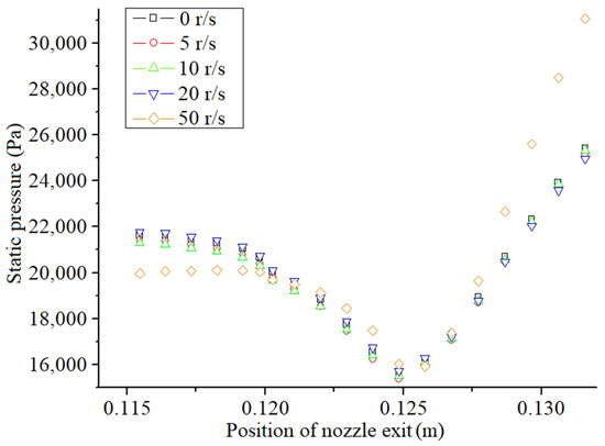 Static pressure distribution of the right nozzle exit at different rotational angular velocities.