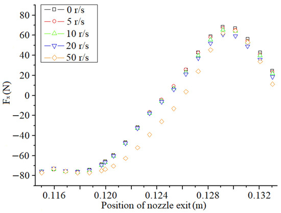 Figure 19 shows the static pressure distribution of the right nozzle exit of the supersonic fluidic element at different rotational angular velocities. Figure 20 shows the thrust distribution of the right nozzle exit of the supersonic fluidic element at different rotational angular velocities. It can be seen from Figure 19 and Figure 20 that the output pressure and thrust curves at angular velocities less than 20 r/s almost coincide. With the increase in the angular velocity, the minimum pressure increases and the position of valley value moves outward, which shows that projectile rotation has an effect on the output pressure and the magnitude and direction of the thrust, but when the angular velocity is low, such as less than 20 r/s, this effect can be ignored. In Figure 19, it can be seen from the left and right ends of the curve that when the angular velocity reaches 50 r/s, the static pressure at the lower point of the right nozzle decreases and the static pressure at the upper end increases. This suggests that the airflow tends to flow towards the upper wall under the effect of centrifugal force. When the angular velocity is small, the centrifugal force is also small, and thus this effect is not obvious. It can be seen from Figure 20 that when the angular velocity is less than 20 r/s, all curves are basically coincident, suggesting that the thrust is basically not affected; when the angular velocity is 50 r/s, the thrust of the middle part increases significantly (about 20 N).
