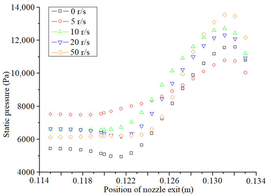 Static pressure distribution of the left nozzle exit at different rotational angular velocities.