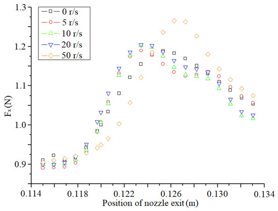 Thrust distribution along the left nozzle exit at different rotational angular velocities.
