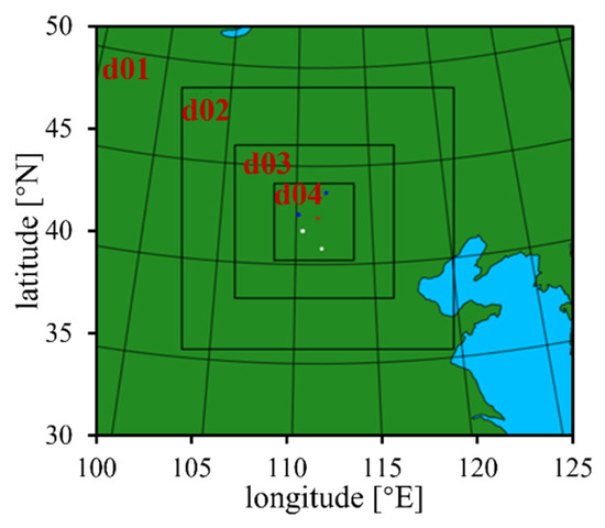 Focused on the central point of the main landing field (111.430°E, 42.350°N), the WRF model is fourfold-nested and has horizontal resolutions of 27, 9, 3 and 1 km, respectively. The four domains interact with each other through a two-way nesting strategy [19]. The finest domain covers the central point, with an area of 419 km from east to west and 419 km from south to north, as shown in Figure 1. The vertical resolution is 1.5 m from the surface to 20 m, 10 m from 20 to 100 m, 20 m from 100 to 250 m, 150 m from 250 to 1000 m, and 500 m from 1000 to 12,000 m, giving a total of 59 levels.