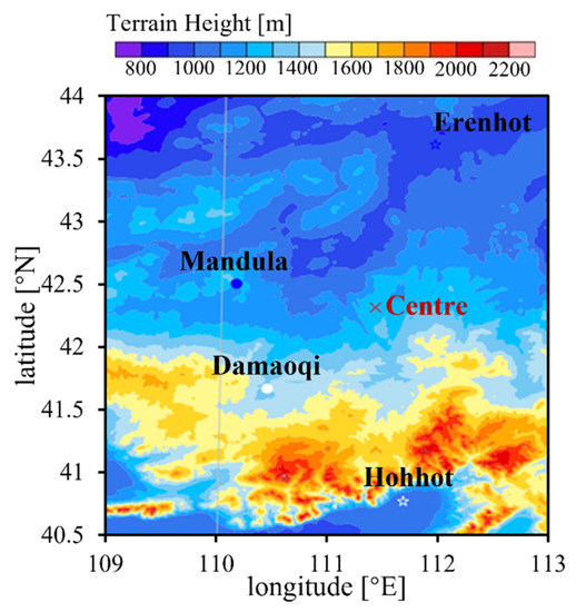 The results of the WRF model are compared to observations from the surroundings of the landing center, including data collected from the Erenhot and Hohhot radio-sounding stations, as well as from the Mandula and Damaoqi weather stations. The respective position coordinates of the four observation stations are shown in Table 2. The terrain height map of the main landing field and these four observation stations and their geographical relationships are shown in Figure 2.