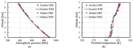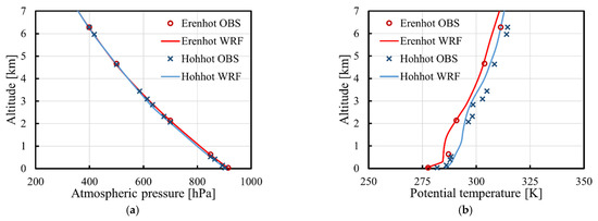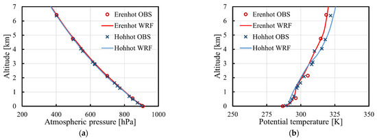 Profiles of (a) atmospheric pressure and (b) potential temperature above the main landing area from WRF and upper-atmosphere sounding data at 12:00 LST on 25 June 2013.