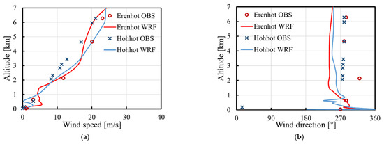 Profiles of (a) wind speed and (b) wind direction above the main landing area from WRF and upper-atmosphere sounding data at 12:00 LST on 25 June 2013.
