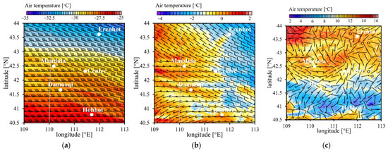 Stratified wind vector maps at altitudes of about (a) 6700 m, (b) 2000 m and (c) 15 m, respectively.