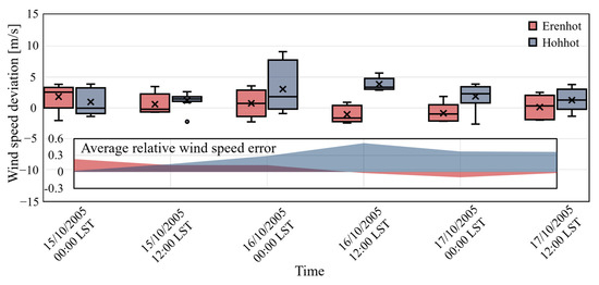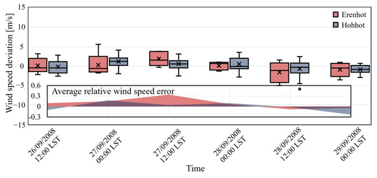 Table 4 further shows the specific statistical biases of the mean wind speed. It can be seen that the average deviations are scattered around zero and have relatively small absolute values. The maximum absolute value of both average deviations in Erenhot and Hohhot does not exceed 2 m/s. In particular, average variations at 12:00 LST on 26 September 2008 are tiny; the absolute values are no more than 0.20 m/s.