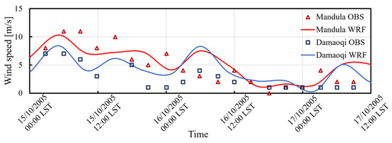 Variation of near-surface wind speed above the main landing area from WRF and weather stations from 00:00 LST on 15 October 2005 to 12:00 LST on 17 October 2005.