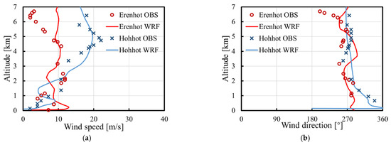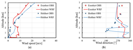 With the results in Hohhot as an example, Table 5 shows relative wind speed error between WRF and upper-atmosphere sounding data obtained at 12:00 LST on 26 September 2008. Several feature points in the respective altitude ranges clearly show that the maximum relative wind speed error is controlled within 10%. The average absolute value of the relative wind speed error is only 4.52%. This means that the WRF model system can forecast well the wind speed field at all altitude layers.