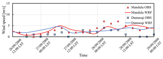 To validate the wind speed forecasts near the surface, Figure 11 shows a near-surface wind speed variation comparison in the simulation period from 12:00 LST on 26 September 2008 to 00:00 LST on 29 September 2008 in this case. In comparison with Figure 7, in the “Shen Zhou 6” case, the overall wind speed near the surface is small, almost no more than 5 m/s. Under these circumstances, it is more difficult for WRF to capture the wind speed field precisely. From Figure 11, it can be seen that the WRF forecasts in Mandula are better than those in Damaoqi. In Mandula, wind disturbance and variation changes are well reproduced and consistent with observations. In contrast, relatively significant deviations occurred between WRF forecasts and observation data in Daomaoqi. However, since near-surface wind speed is rather low, the absolute value of deviations is also tiny, exhibiting less impact on a trajectory.