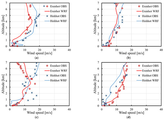 To verify whether the inconsistency between wind speed profiles from two neighborhood radio-sounding stations is common or accidental, Figure 14 further shows profiles of the wind speed at the other four moments. It can be seen that the divergence in wind speed profiles is incidental. In combination with Figure 13a and Figure 14c, this is an occasional phenomenon on 25 June 2013. Most of the time, as seen in Figure 14a,b,d, the wind behaviors are generally consistent at both Erenhot and Hohhot.