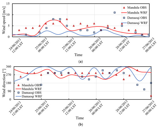 Figure 15 shows the variation of near-surface wind speed and wind direction above the main landing area obtained from WRF and weather stations from 12:00 LST on 24 June 2013 to 00:00 LST on 27 June 2013. It can be seen that the overall prediction of the near-surface wind field by the WRF model system is consistent with the observations. By comparison, the WRF forecasts in Mandula are better than those in Daomaoqi, which is similar to that concluded from the “Shen Zhou 7” case.