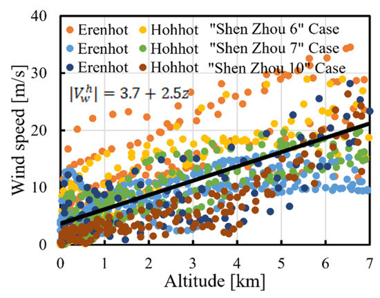 The linear relationship described in Equation (2) has been fitted to the WRF forecast data from the above three cases, as shown in Figure 16. Using 18 independent WRF simulated -profiles across surrounding locations (the Erenhot and Hohhot radio-sounding stations) of the landing center, typical and values are found. It is clearly seen that and can be used to approximate -profiles constructed from WRF datasets.