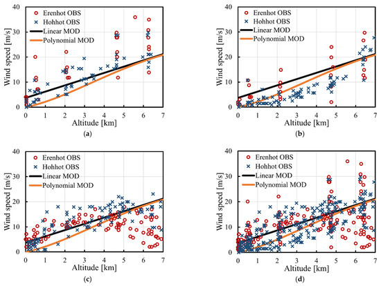 Specifically, from Figure 17a,c, the polynomial model underestimates the wind speed below 4 km, as this altitude range is beyond its applicability. In this range, the proposed linear model shows more consistency with data obtained from radio-sounding stations. On the other hand, in the altitude range of 5 km–7 km, the two models have remarkably similar prediction trends. Considering that the polynomial model is proposed and validated based on the abundant observational high-altitude data, it can be concluded that the current model has good accuracy and reproduces the wind behaviors in this range well.