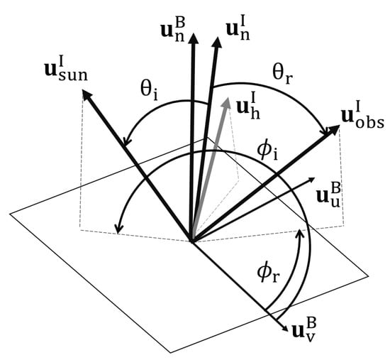 The surface of an object can be decomposed into a finite number of flat facets, and the properties of each facet can be described by a set of vectors. Therefore, we can simulate and analyze the individual facet of the object and then combine them together. The illumination geometric relationship of a single facet is shown in Figure 1. Superscript I denotes that the vector is expressed in inertial coordinates, superscript B denotes that the vector is expressed in body coordinates. Here, u u B , u v B , and u n B are three unit vectors representing the facet; u n B is the normal vector of the lighted facet; u u B and u v B are the in-plane vector. Furthermore, the unit vector u sun I points to the Object-to-Sun direction, and the unit vector u obs I points to the Object-to-Observer direction; u h I is the Sun–Object–Observer bisector.