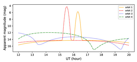The brightness of space debris results from the joint action of many factors. How does each factor affect the brightness of space debris? In general, the larger the area, the brighter the space debris under the same reflection conditions. In this section, the influence of several primary factors on the brightness of space debris is analyzed by using the control variable method. Suppose that we have a space debris X , which is shaped like a cube, and the area of each facet is set as 16 m 2 . The simulation time was from 12:00 to 20:00 (UTC) on 10 October 2020. The simulation was conducted for the station from which the debris was observed. We consider the following three scenarios at the same station: