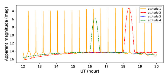 Here, the attitude is selected as the three-axis stabilized attitude control system, with Z axis pointing to the nadir and X axis pointing to the velocity direction. The parameters of the Phong model and the reflection parameters are n u = n v = 12 , 000 , R spec = 0.8 , and R diff = 0.2 . GEO orbit and MEO orbit are selected, with the orbit altitude of about 36,000 km and 20,000 km . Each type of orbit is divided into two orbits with different inclinations. The TLE is shown in Table 1, and the corresponding synthetic light curves are shown in Figure 2.
