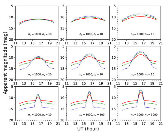 Here, the TLE of Orbit 1 in Table 1 and Attitude 4 in Section 2.2.2 (Figure 5d) are used in the following simulations. We compare the changes of the synthetic light curves under different parameters of the Phong model ( n u , n v ) and different reflection parameters ( R spec , R diff ), and the results are shown in Figure 7.