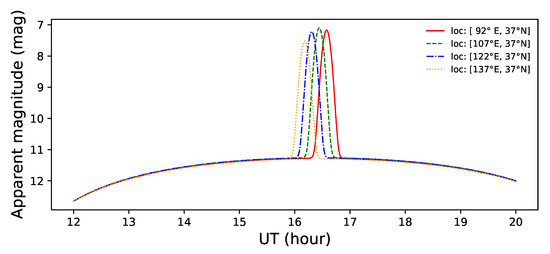 It can be seen from Figure 8 that the light curves of space debris observed at identical latitude and different longitude stations have a time shift of about eight minutes, and there is not much difference in the size of the peak value. It can be inferred that the difference in longitude will lead to a specific time difference in the observed peak position. The time shift is caused by the geometric relationship of space debris to the station and the Sun. In order to observe the peak phenomenon of space debris, the geometric relationship between the Sun, the debris, and the observer needs to satisfy certain specular reflection conditions. In the case of simulation in this section, the latitude of the two stations is 37 N, and the longitude difference is 15 . The angular distance between the object and the two stations can be calculated to be about 2 . The orbit of the space debris is GEO orbit, the orbital period is 1436.16 min, and the angular distance that the debris travelled is about 2 in eight minutes. Therefore, when two stations with 15 longitude difference reach the same geometric observation conditions, there will be a time difference of eight minutes. As can be seen from Figure 9, the peak positions of space debris observed by stations at identical longitude and different latitudes are roughly consistent. However, there is a big difference in the amplitude of the peak values. It can be inferred that peaks may be observed at certain latitudes that are not observed at other latitudes, which is consistent with the actual observation situation. In conclusion, the longitude of the observation station determines when the peak is located, and the latitude determines whether we can observe the peak and how prominent the peak is.