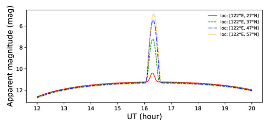 Here, the orbit and attitude are the same as those in Section 2.2.3. The parameters of the Phong model and the reflection parameters are n u = n v = 12 , 000 , R spec = 0.2 , and R diff = 0.8 . We change the location of the observation station, 15 apart in longitude and 10 apart in latitude, and the results are shown in Figure 8 and Figure 9.