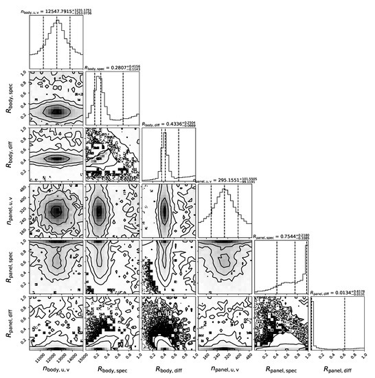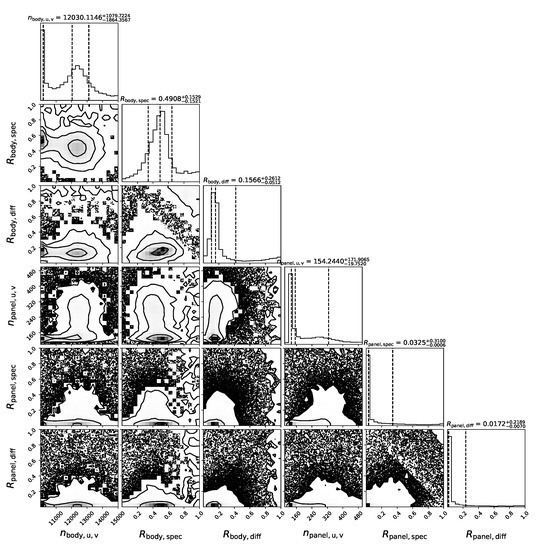 Define − ln p ( D | Θ ) i = 1 N ( f model f obs σ obs ) 2 as the likelihood function; f model is the model values. f obs , and σ obs are the observed values and their errors, respectively. We assume that all materials of the research object are isotropic (i.e., n u = n v ). Therefore, parameter space Θ = [ n body , u , v , R body , spec , R body , diff , n panel , u , v , R panel , spec , R panel , diff ] includes the parameters of the Phong model of the body, the specular reflectance of the body, the diffuse reflectance of the body, the parameters of the Phong model of the solar panel, the specular reflectance of the solar panel, and the diffuse reflectance of the solar panel.