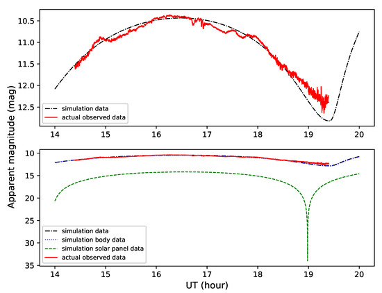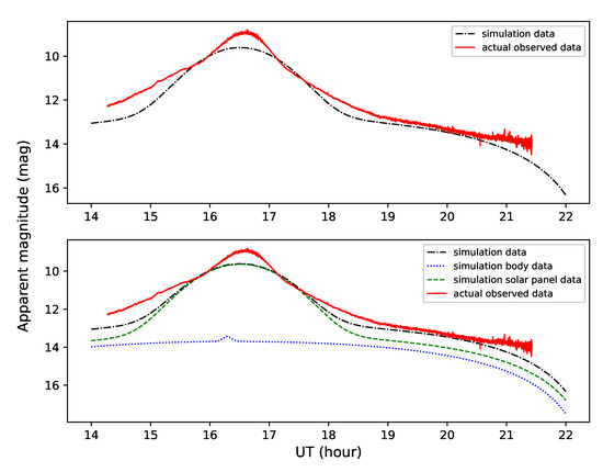 We obtained the best-fitted results of surface material parameters by comparing the observed light curves with the synthetic light curves, as shown in Table 3. The results of optimal parameters were put into the simulation model. We divided the overall brightness of each object into the brightness of the body and the solar panels. The contrast diagram of the light curves are shown in Figure 13 and Figure 14. The light curves shown in Figure 13 are slightly different at the peak position. The synthetic light curve changes more gently than the observed one. The simulation model used in this paper did not consider the occlusion between components, which may be the cause of this difference. From Figure 13, it can be seen that for Object 1, the overall brightness change is caused by the brightness change of the solar panels, while the brightness change of the body is so small that it is ignored. For Object 2, the brightness of the body determines the overall brightness, and the contribution of the solar panels is small and covered (see Figure 14). Therefore, for Object 1, we could think that only the material of the solar panels is relatively accurate, and the material of the body could not be determined. On the contrary, for Object 2, we could confirm the material of the body, but we could not infer the material of the solar panels.