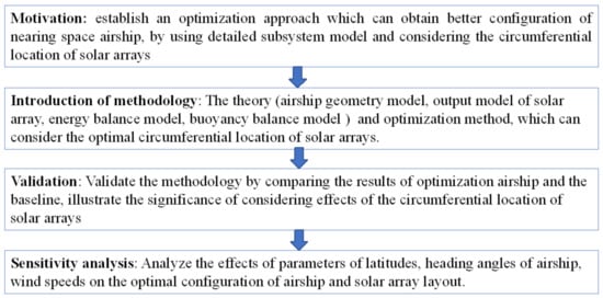 This study proposes an optimization methodology for searching for the optimal layouts including the central angle of solar array on airship envelope, considering the trade-offs among different disciplines and critical constraints of energy balance and buoyancy equilibrium. The proposed methodology can optimize the stratospheric airship configurations by considering the envelope shape, the solar array layouts, etc., using detailed subsystem models. Based on the proposed method, an optimization case on a baseline airship model is conducted and discussed. Furthermore, the effects on the airship design of latitudes, heading angles and average resisting wind speeds are studied in detail. The rest of the paper is organized in four parts, viz., Theory, Optimization Method, Results and Discussions, and Conclusions. Figure 1 shows the research plan of the paper.