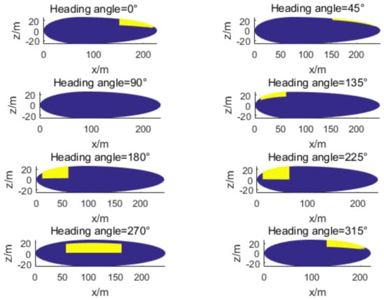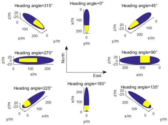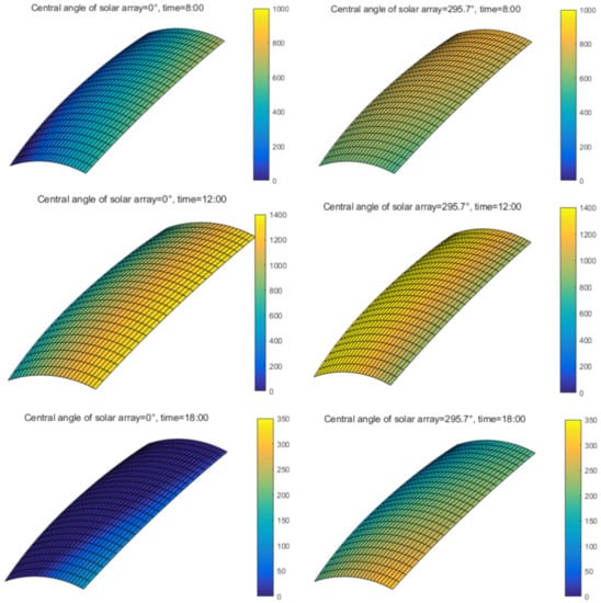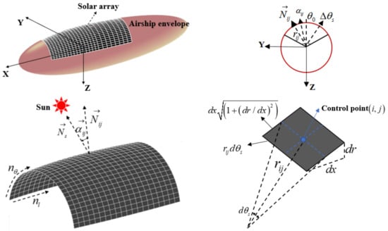 Figure 4 shows the sketch of the body–axis coordinate system and the solar array cell. The stabilizers are located at the tail of airship, and their design is such that they never cast a shadow over the solar panel. The solar array is curved, and its curvature is consistent with that of the airship. It is assumed that the array consists of many micro-modules, which are assumed to be planes. The solar panels are supposed to operate at a nominal temperature, hence the impact of the temperature has not been included here. As shown in the figure, is the circumferential radius of the element, is the normal vector of the element surface, is the total included angle of the solar array. The array is divided into (along with length) × (along with circumference).